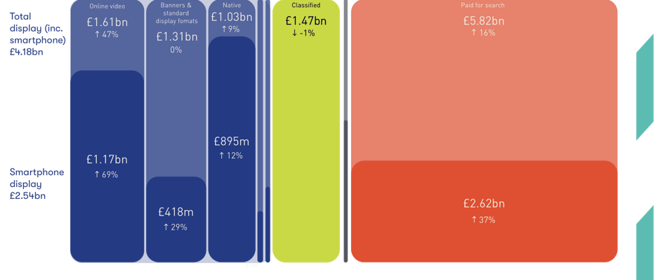 - Paid for search rose 16% to £5.82bn, classifieds fell -1% to £1.47bn