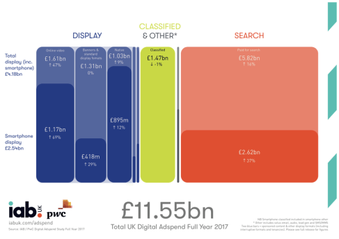 Video contributed heavily to the total amount spent across all smartphone advertising rising by 37.4% to £5.2bn. As a result, 45% of all digital ad spend went on smartphones – compared to just 9% five years ago. However, the IAB’s chief digital officer Tim Elkington noted “there’s still significant room for smartphones share to grow” as they accounted for 59% of online time¹ in the final quarter of 2017.